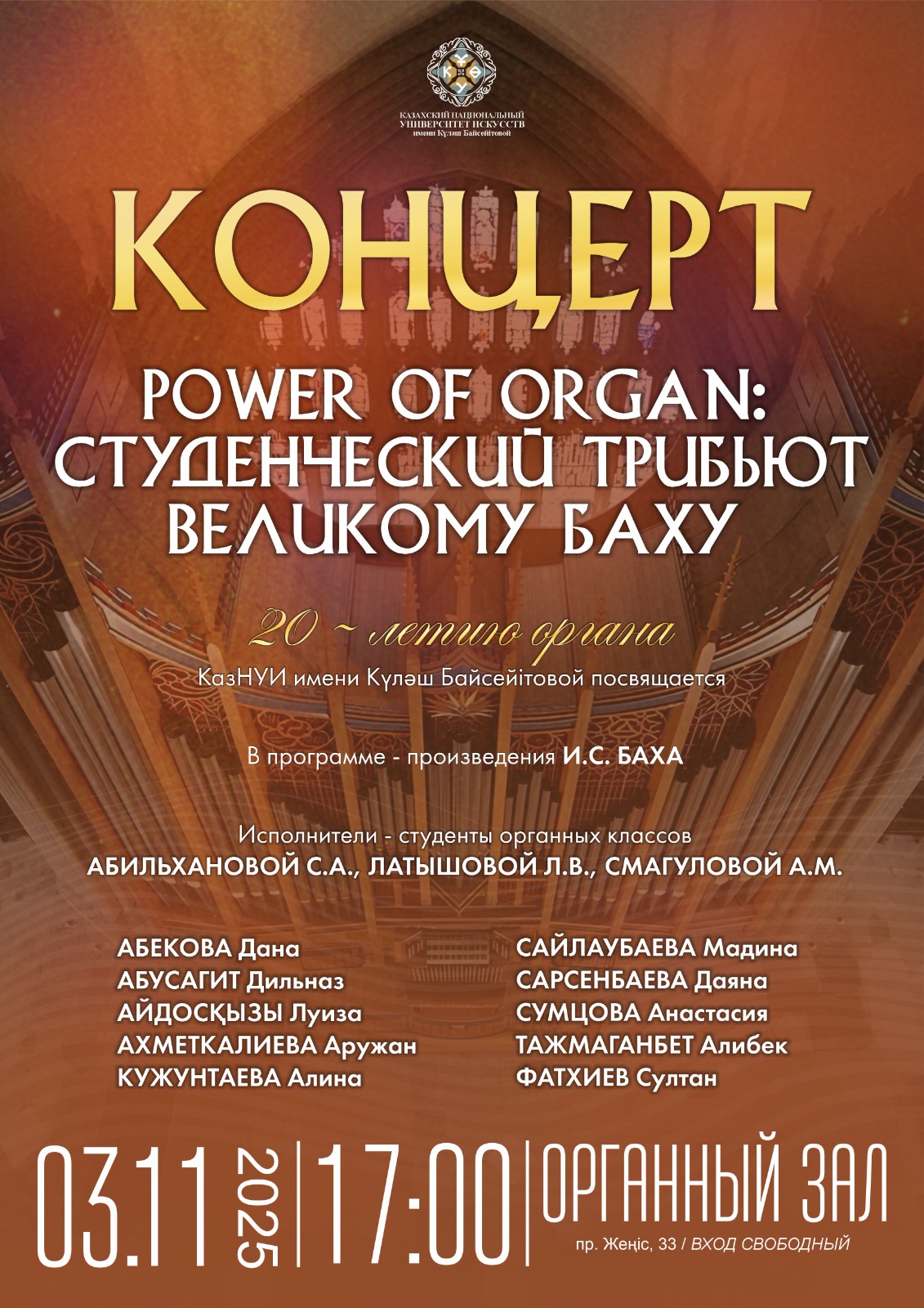 2025 жылдың 3 қараша күні сағат 17:00-де Сіздерді Power of Organ: Бахқа арналған студенттік трибьют атты концертке шақырамыз.