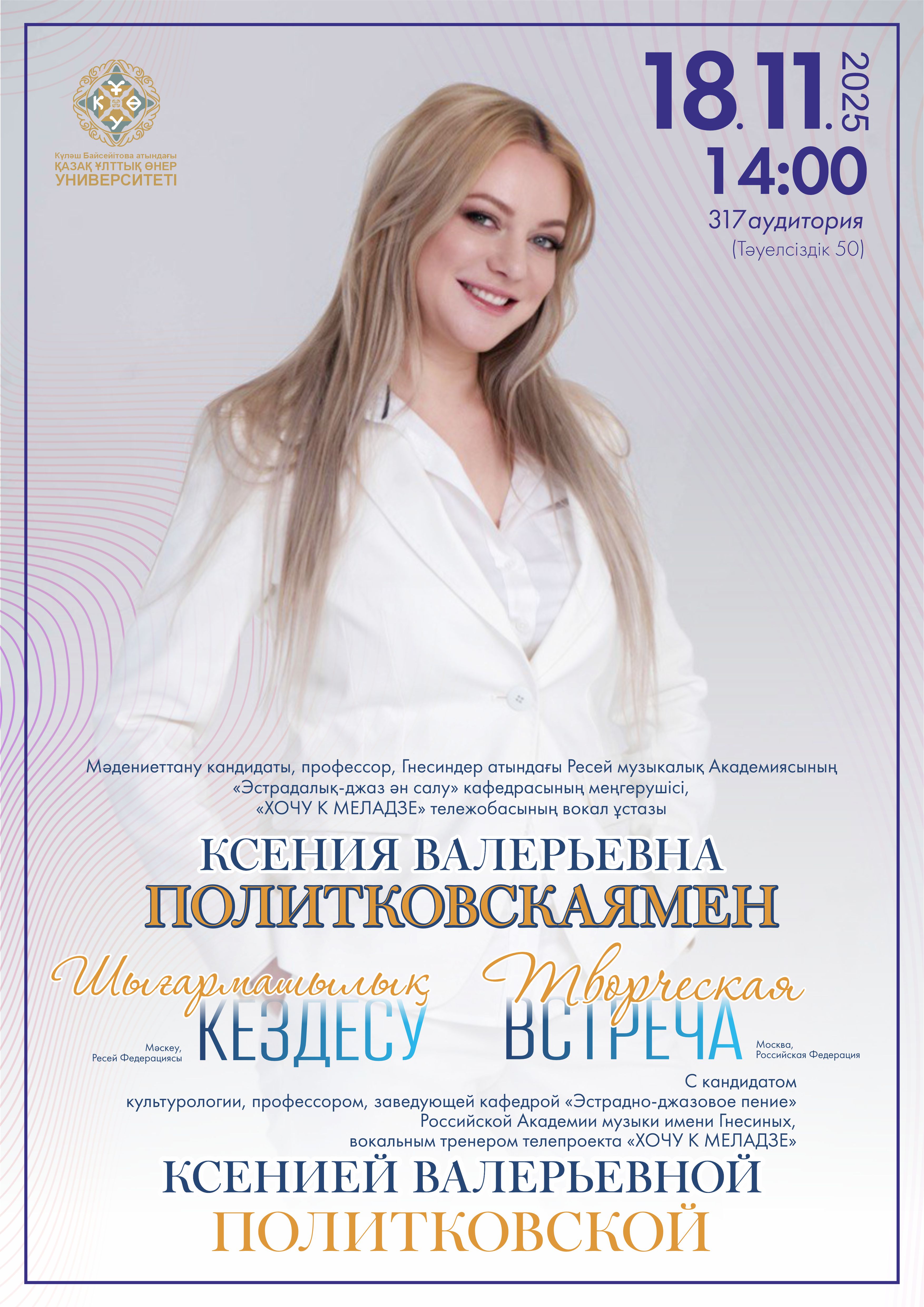 2025 жылдың 18 қараша күні сағат 14:00-де Сіздерді Гнесиндер атындағы Ресей музыкалық Академиясының «Эстрадалық-джаз ән салу» кафедрасының меңгерушісі, профессор К.В. Политковскаямен шығармашылық кездесуге шақырамыз!