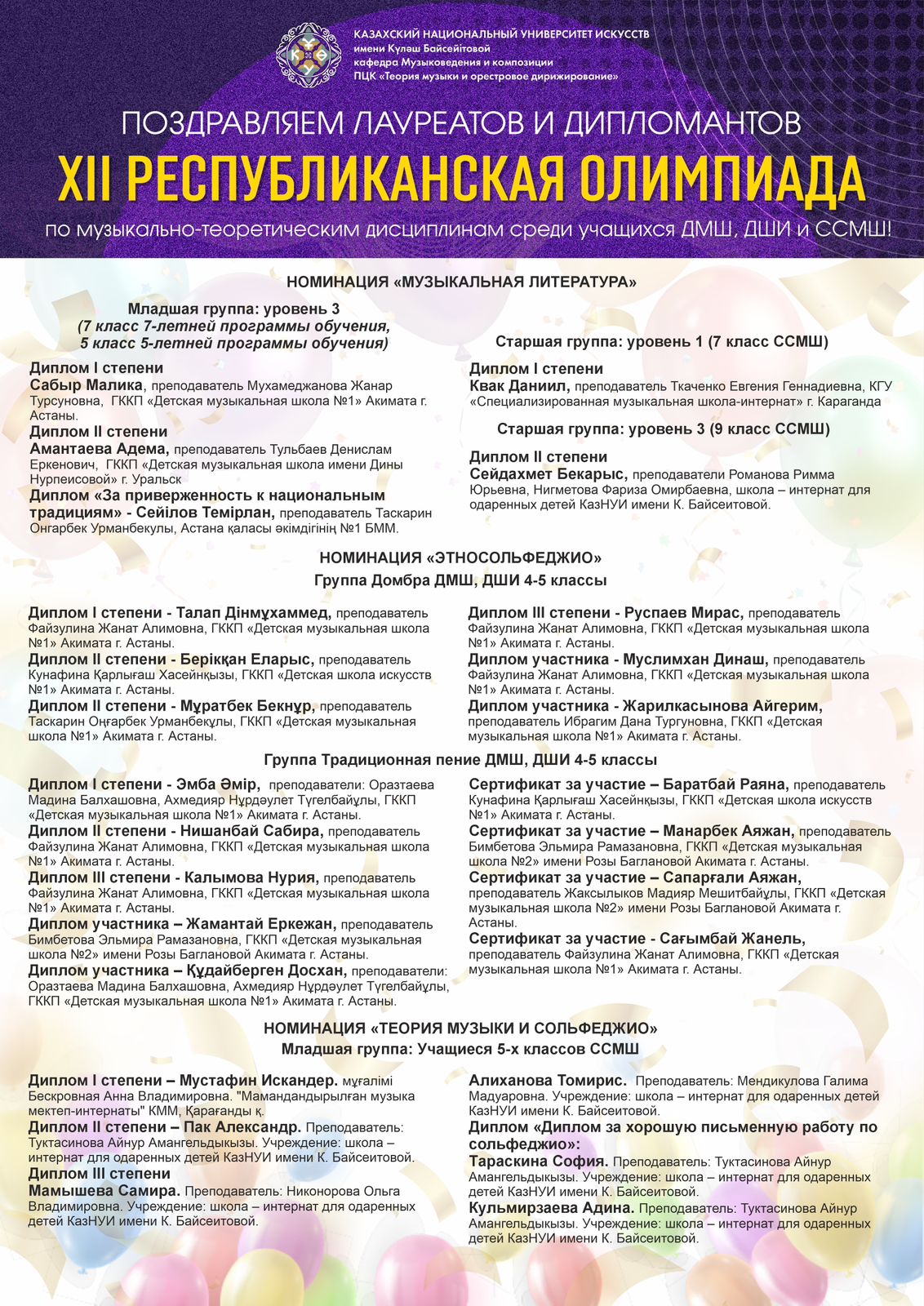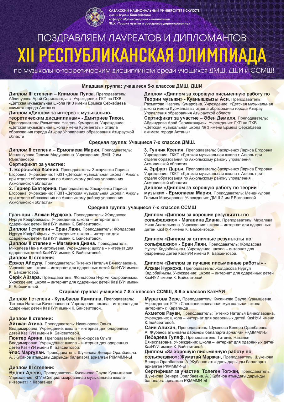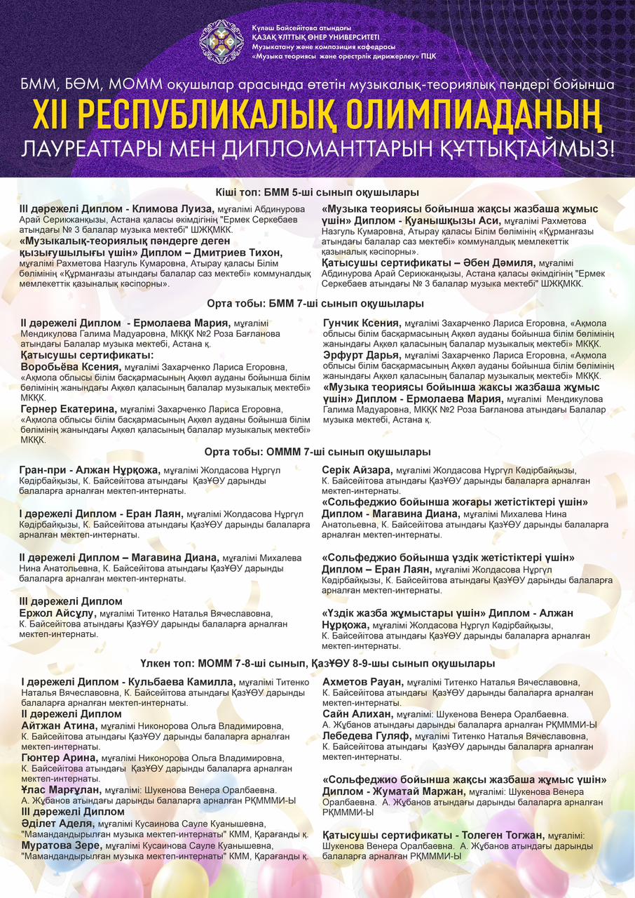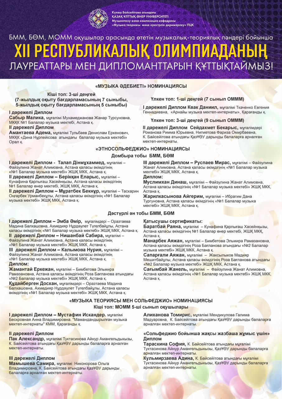 БММ, БӨМ, МОММ оқушылар арасында өтетін музыкалық-теориялық пәндері бойынша ХІI Республикалық Олимпиаданың Лауреаттары мен Дипломанттарын құттықтаймыз!