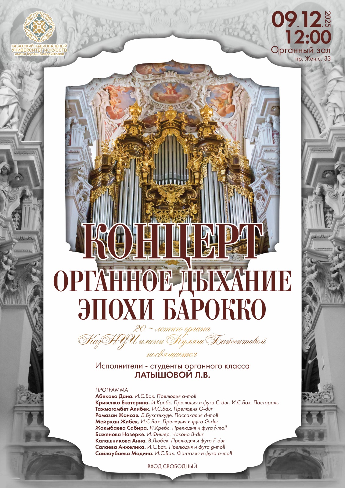 2025 жылдың 9 желтоқсан күні сағат 12:00-де Сіздерді ҚазҰӨУ органының 20 жылдығына арналған «Органное дыхание эпохи Барокко» атты концертке шақырамыз!