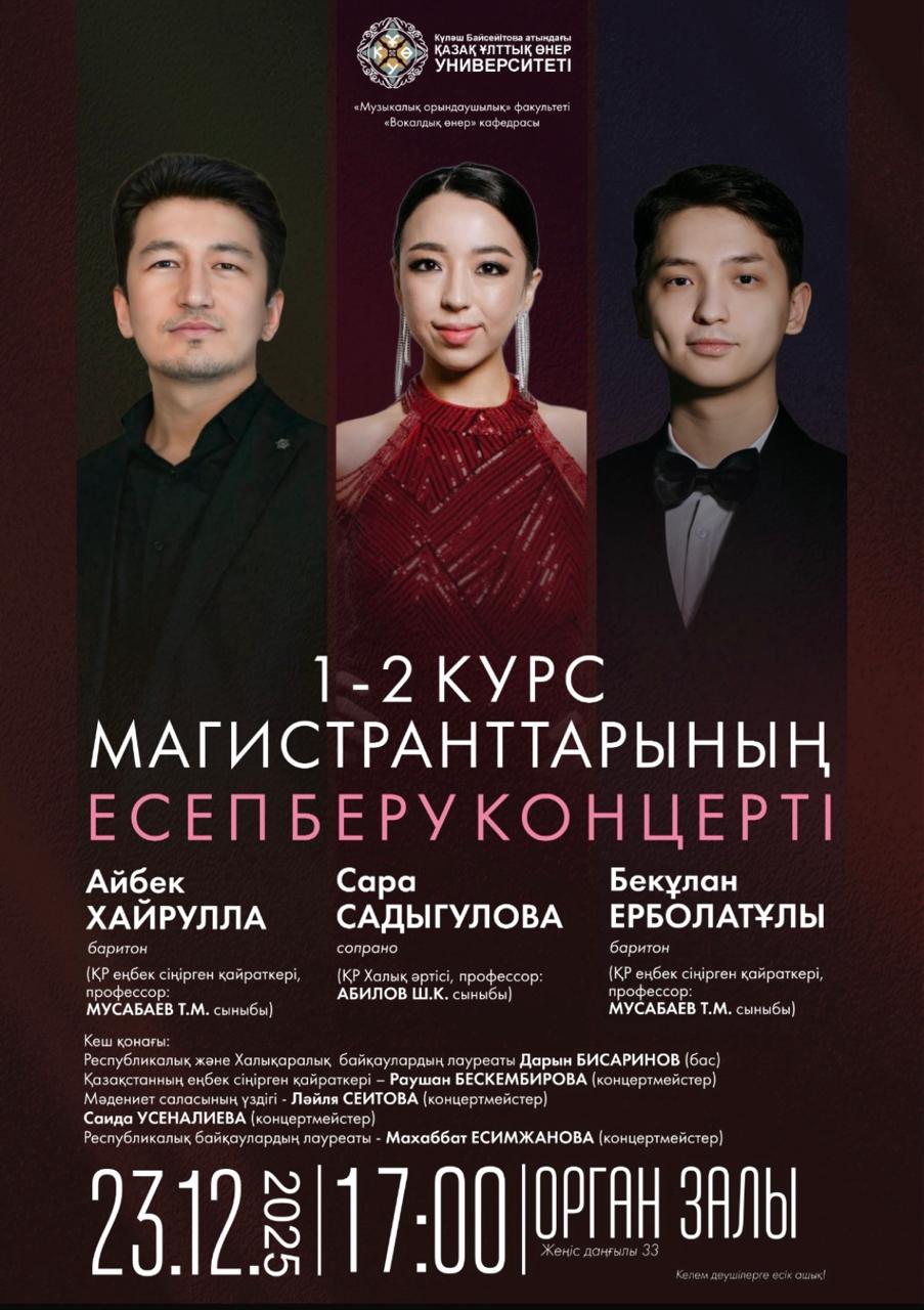 2025 жылдың 23 желтоқсан күні сағат 17:00-де Сіздерді 1-2 курс Магистранттарының есеп беру концертіне шақырамыз!