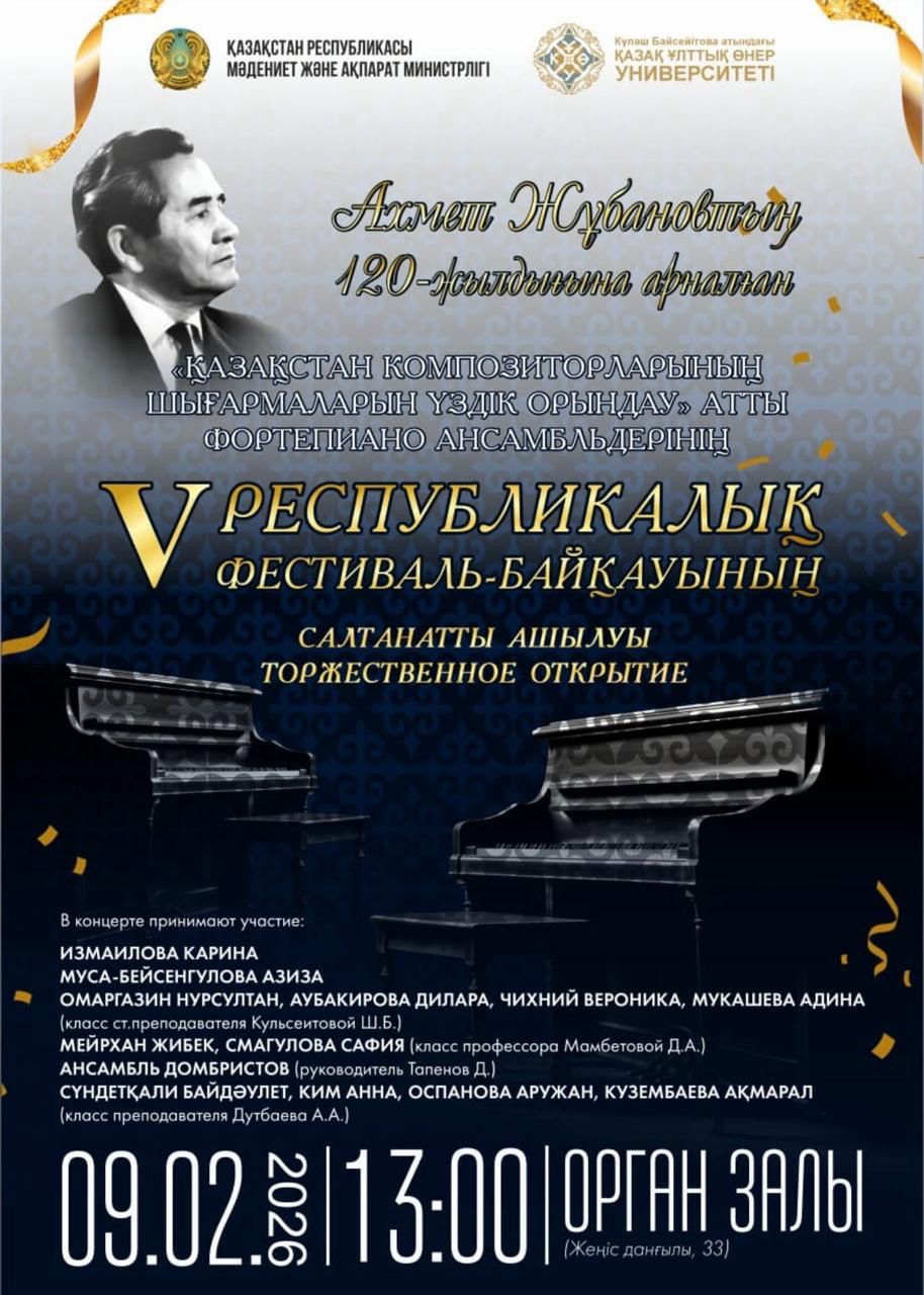 2026 жылдың 9 ақпан күні ҚазҰӨУ-де «Қазақ композиторларының шығармаларын үздік орындау» атты V Республикалық фортепиано ансамблінің байқауының салтанатты ашылуы өтеді.