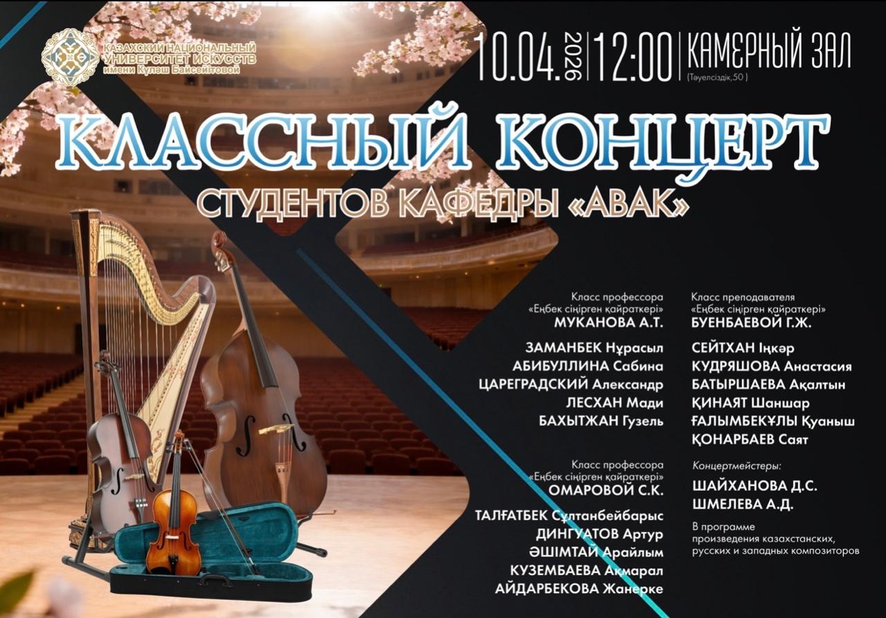 2026 жылдың 10 сәуір күні Сіздерді «АВАК» кафедрасының студенттерінің сыныптық концертіне шақырамыз!